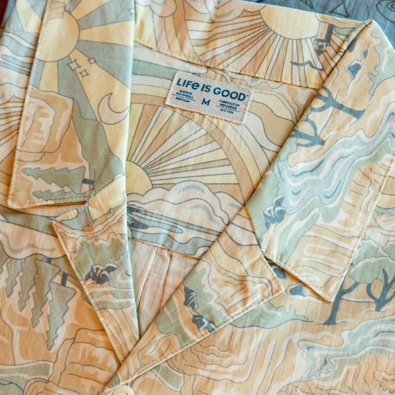 - Life is Good label inside lower hem placket